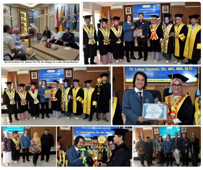 Surabaya. | Anggota Depkumham PJI (Departemen Hukum dan HAM Persatuan Jurnalis Indonesia), Lukas Santoso, S.H., M.H., M.M., M.Si., yang juga advokat senior, raih gelar Doktor Manajemen dari Fakultas Ekonomi dan Bisnis Universitas Dr. Soetomo (Unitomo) Surabaya dalam sidang terbuka di Gedung Pascasarjana pada Kamis, 13 Maret 2025. Lukas lulus dengan indeks prestasi kumulatif (IPK) 3,82. Jadi sekarang resmi disandang gelarnya, Dr. Lukas Santoso, S.H., M.H., M.M., M.Si. Tampak hadir di acara, beberapa Tokoh Organisasi Pers, organisasi Advokat dan Organisasi massa serta puluhan pendukung Dr. Lukas.