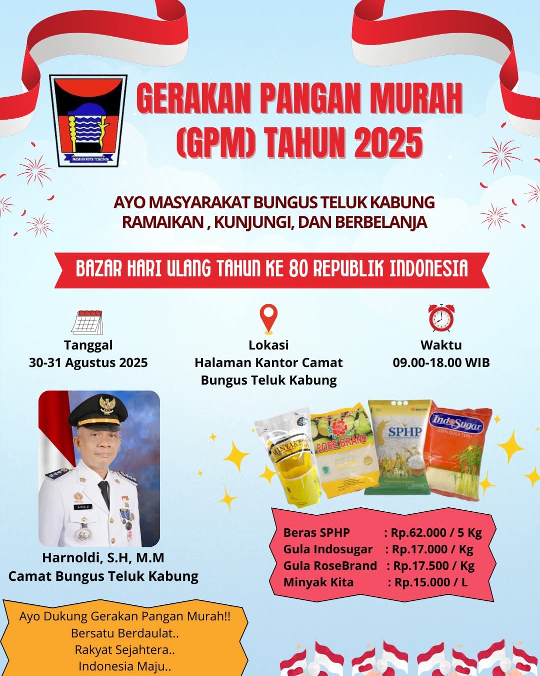 “Kami ingin memastikan masyarakat Bungus Teluk Kabung tidak kesulitan memperoleh kebutuhan pokok dengan harga terjangkau. GPM ini adalah upaya nyata menjaga stabilitas harga sekaligus membantu meringankan beban warga. Dan lebih istimewa lagi, kegiatan ini kita laksanakan di momentum HUT ke-80 RI, sehingga memiliki nilai kebersamaan yang mendalam,” ujar Harnoldi.