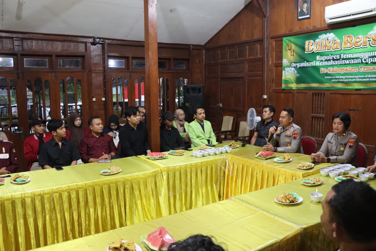 Acara yang berlangsung hangat dan penuh kekeluargaan ini dihadiri langsung oleh Kapolres Temanggung, AKBP Zamrul Aini, S.H., S.I.K., M.H., M.B.A., beserta jajaran Pejabat Utama (PJU) Polres Temanggung. Hadir pula para pimpinan organisasi mahasiswa seperti PMII, HMI, GMNI, IMM, serta perwakilan Dema dari berbagai perguruan tinggi di Temanggung, termasuk INISNU, Stikes Bethesda, Akper Kautsar, dan AKMT.