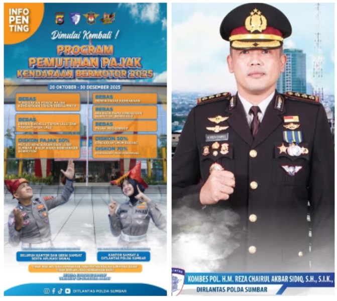 SUMBAR | Semangat baru kembali menggema di Sumatera Barat. Di bawah arahan visioner Direktur Lalu Lintas (Dirlantas) Polda Sumbar, Kombes Pol. H.M. Reza Chairul Akbar Sidiq, S.H., S.I.K., program Pemutihan Pajak Kendaraan Bermotor Tahun 2025 resmi bergulir mulai 20 Oktober hingga 30 Desember 2025. Langkah ini menjadi bukti nyata kehadiran Polri yang peduli dan dekat dengan masyarakat, khususnya dalam memberikan kemudahan di bidang pelayanan publik.