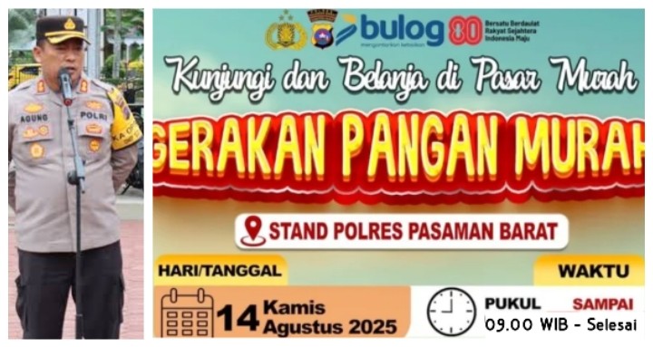 PASAMAN BARAT | Di tengah harga kebutuhan pokok yang terus berfluktuasi, Kapolres Pasaman Barat AKBP Agung Tribawanto tampil di garda terdepan menghadirkan solusi nyata bagi warga. Melalui sinergi dengan Perum Bulog, Polres Pasaman Barat menggelar Gerakan Pangan Murah pada Kamis, 14 Agustus 2025, di Stand Polres Pasaman Barat, mulai pukul 09.00 WIB hingga selesai.