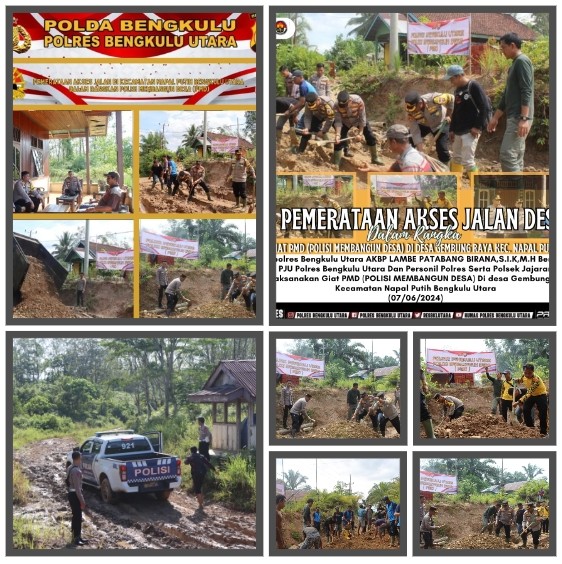 BENGKULU UTARA | Semangat kebersamaan antara warga Desa Gembung Raya , Tanjung Kemenyan dan Polri dalam bergotong royong dalam Kegiatan Polri Membangun Desa (PMD) merupakan Program unggulan Polres Bengkulu Utara. Kegiatan tersebut bentuk aksi sosial & peduli Polri terhadap masyarakat desa yang berada di wilayah Bengkulu Utara (07/06/24).