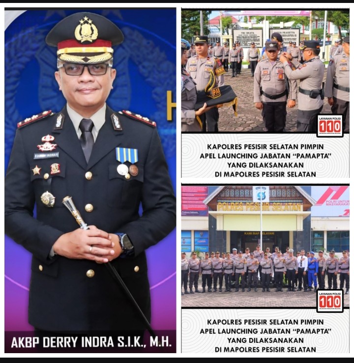 PESISIR SELATAN | Langkah nyata dalam memperkuat pelayanan publik kembali dilakukan Polres Pesisir Selatan. Di bawah kepemimpinan Kapolres Pesisir Selatan AKBP Derry Indra, S.I.K., M.H., jajaran kepolisian meluncurkan jabatan baru bernama Perwira Pengawas dan Penyelidik Pertama (Pamapta), Sabtu 18 Oktober 2025 di halaman Mapolres setempat.