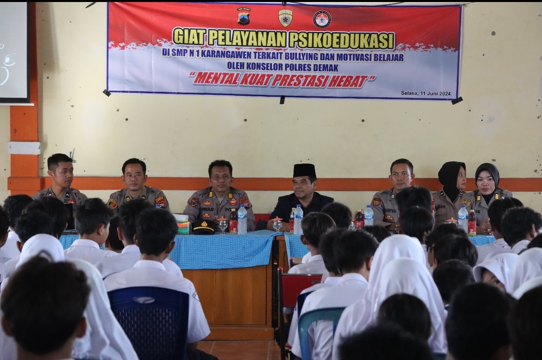 Demak – Polres Demak menggelar Psikoedukasi Anti-bullying bagi pelajar di SMP N 1 Karangawen. Kegiatan tersebut dalam rangka Hari Bhayangkara Ke-78 dengan tujuan untuk mencegah terjadinya kasus bullying yang kerap terjadi di sekolah.